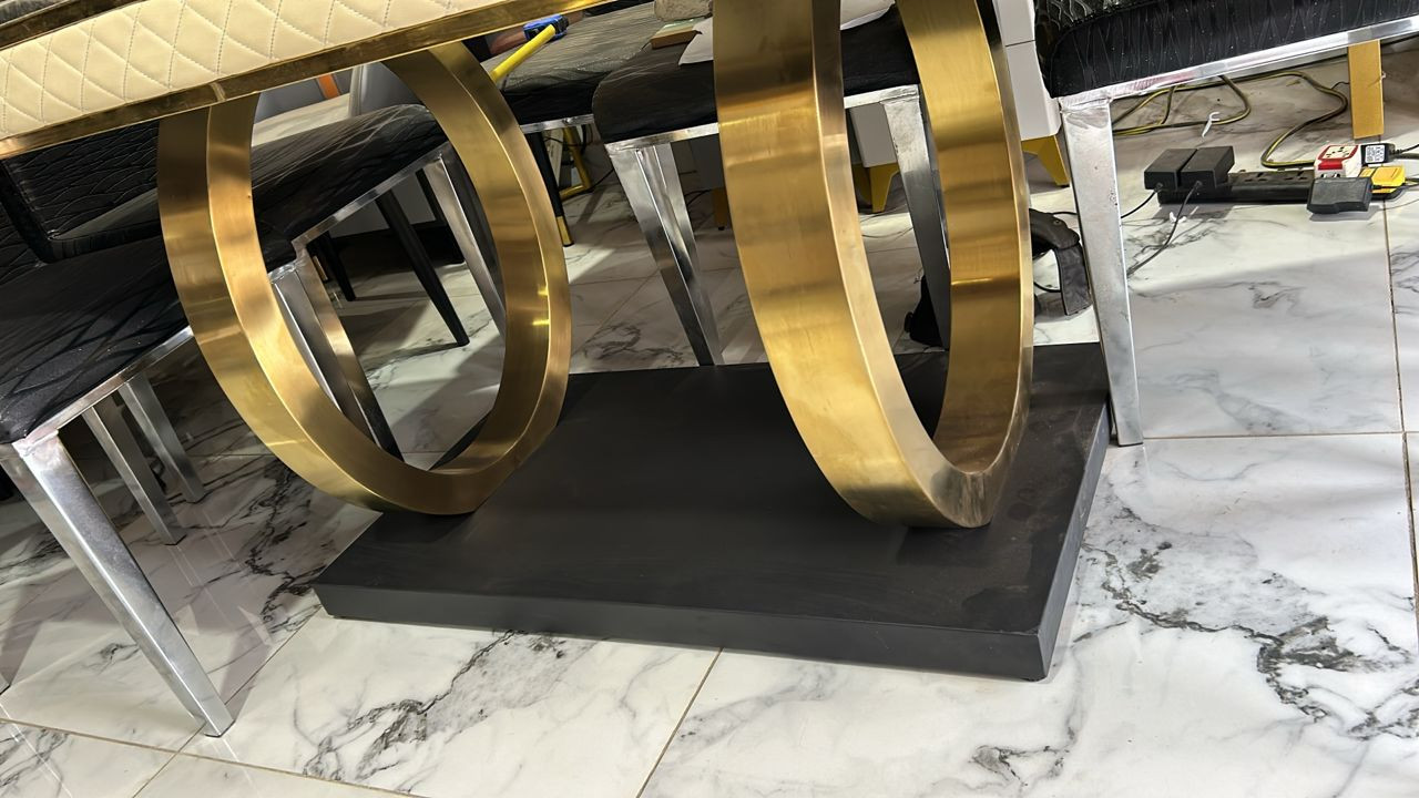 Elevate your dining experience with this classic 6-seater dining set, featuring a stylish dining table with a stunning marble design top supported by two elegant round gold legs. This set combines sophistication and functionality, making it the perfect centerpiece for family meals and gatherings.