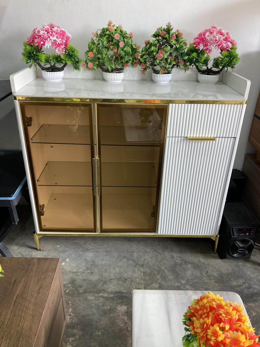 - Glass Doors: Two glass-fronted doors elegantly framed in gold, allowing you to showcase decorative items while adding a sense of opulence.