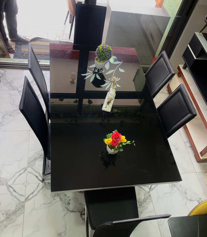 Elevate your dining experience with this sleek and contemporary dining table set. Designed with functionality and style in mind, the table features a double glass design—one top layer for elegance and practicality and a bottom layer for added storage or decoration. Paired with ergonomically designed black chairs with chrome legs, this set exudes sophistication and modern charm, making it perfect for any dining space.